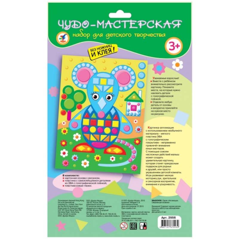 В комплекте: цветная основа с рисунком и клеевым слоем, цветной песок, цветная фольга, пушистые палочки, пластмассовые глазки, деревянная палочка, кисточка.