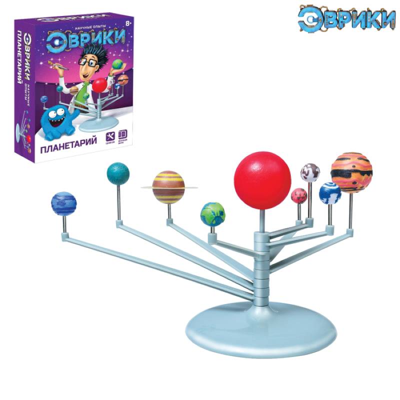 Соберите планеты Солнечной системы и раскрасьте их с помощью кисточки, ориентируясь по рисунку на упаковке. После того как небесные тела будут окрашены, выделите некоторые участки специальной краской, и они будут светиться в темноте, как по волшебству. Установите готовые планеты на специальный держатель — модель Солнечной системы готова!