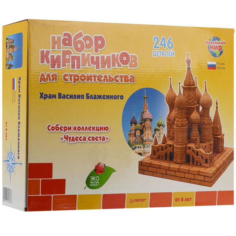 Набор кирпичиков для строительства 'Храм Василия Блаженного' привлечет внимание не только ребенка, но и взрослого. Набор включает в себя все необходимое для строительства макета великолепного храма: 246 готовых глиняных кирпичиков, специальный нетоксичный цемент, лоток для смешивания, мастерок и инструкцию на русском языке.