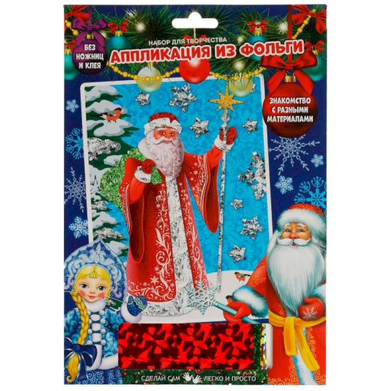 С помощью красочной основы и блестящей разноцветной фольги маленький художник сможет самостоятельно создать новогоднюю аппликацию с изображением Дедушки Мороза. Готовую поделку можно подарить близким или использовать для украшения интерьера.