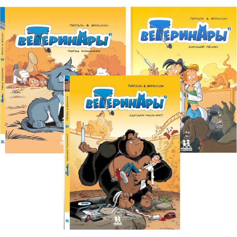 В третьем, заключительном томе серии «Ветеринары» читатели снова встретятся с парочкой неунывающих докторов, которые наверняка успели понравится и детям, и взрослым. Да и как может быть иначе, если доктор Дан и доктор Нат то и дело проявляют чудеса изобретательности и профессионального мастерства, чтобы снять с Эйфелевой башни кота, привить сотню-другую мышей или вытащить из пасти циркового льва застрявшую там голову дрессировщика! Однако работа ветеринара — это общение не только с животными, но и… с их хозяевами! Бельгийские авторы Пераль и Жильсон создали целую галерею забавных, рассеянных, а порой и вовсе немного чокнутых любителей живности, без которых не обходится практически ни одно миниприключение доктора Дана и доктора Нат. И даже неизвестно, что отнимает у них больше сил: утомительные погони за боящимися прививок кошками и собаками или разговоры с их чудаковатыми владельцами!