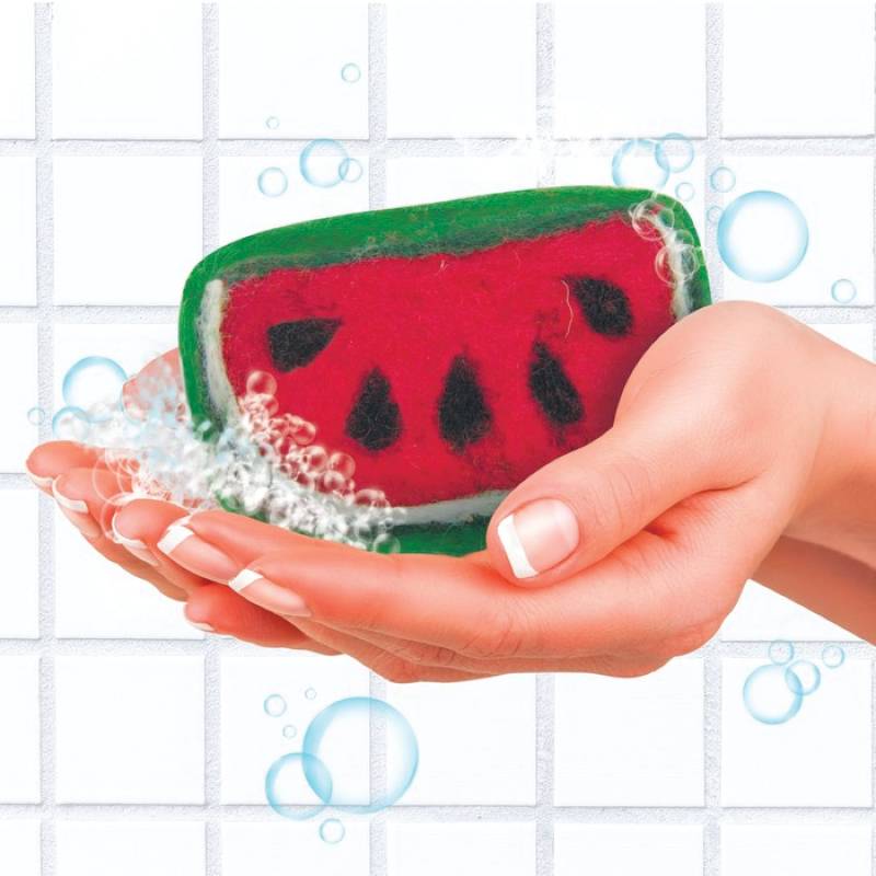 С помощью специальной иглы присоединяйте лоскуты цветной шерсти к мылу-основе и создавайте рисунок по схеме. Как это сделать, подробно описано в инструкции, а также в видео с мастер-классом (QR-код внутри упаковки).