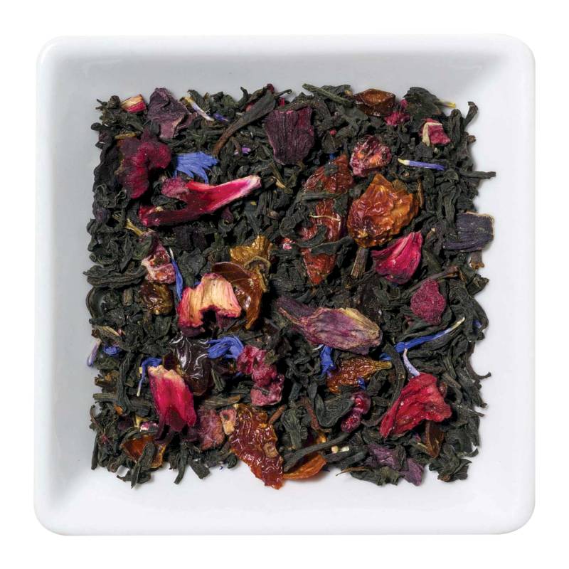 Представляем Вам яркий и сочный фруктовый купаж из отборного черного чая с добавлением ягод годжи, облепихи, граната, шиповника, малины, цветов гибискуса, лепестками василька.